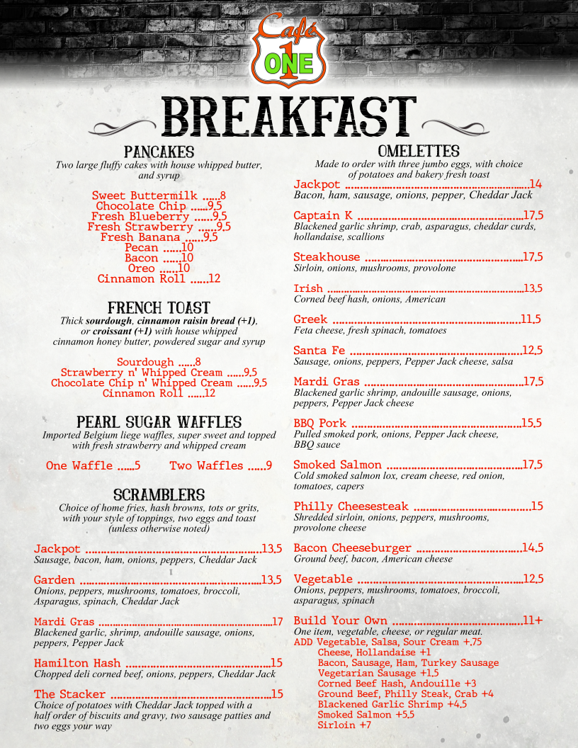 Welcome to Café One, a delightful culinary hub located at 405 US-1, Ormond Beach, FL. This cozy café invites you to experience a unique menu that is both extensive and inviting, with offerings perfect for breakfast and lunch lovers alike.